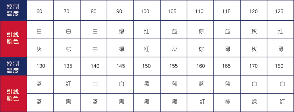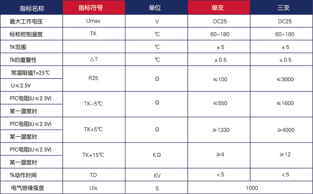 PTC热敏电阻传感器符合德国DIN44081和DIN44082标准。控制温度范围为TK60℃~TK180℃。控制温度TK每间隔5℃设定。